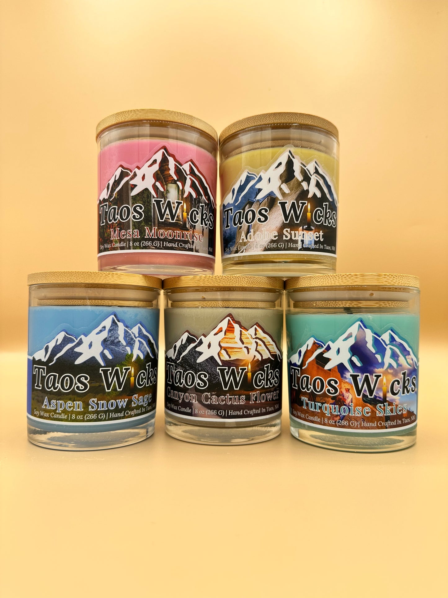 Introducing the "5 Seasons Collection," an extraordinary ensemble of candles that beckons you to experience the essence of Taos, New Mexico throughout the year. Each candle is a sensory journey, carefully crafted to mirror the magic of every season and moment in this enchanting region. Aspen Snow Sage captures the purity of winter with Eucalyptus and White Sage. Turquoise Skies mirrors the vibrant summers with lush green and marine notes. Canyon Cactus Flower celebrates the resilience of Taos' springtime with Cactus Flower and Jade. Mesa Moonrise evokes the timeless autumns with Apple Harvest and White Sage and Lavender. Finally, as day turns to dusk, Adobe Sunset offers the warmth of fine leather and the opulence of Velvet Vanilla. Invest in the "5 Seasons Collection" to embrace the ever-changing spirit of Taos, New Mexico, and elevate your surroundings with its captivating scents, season after season.